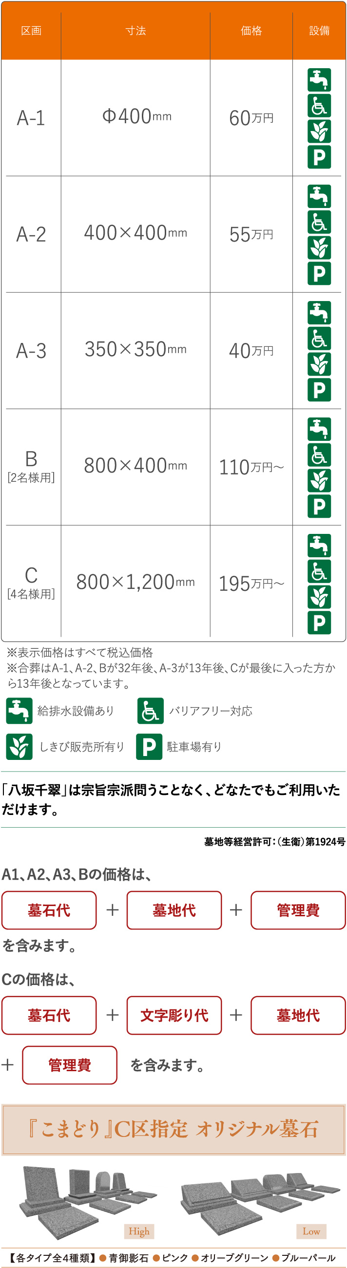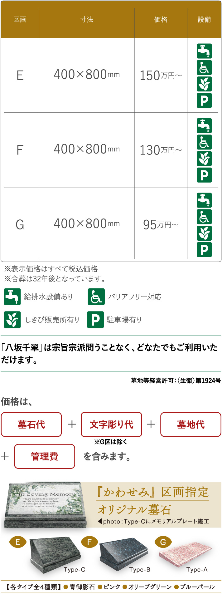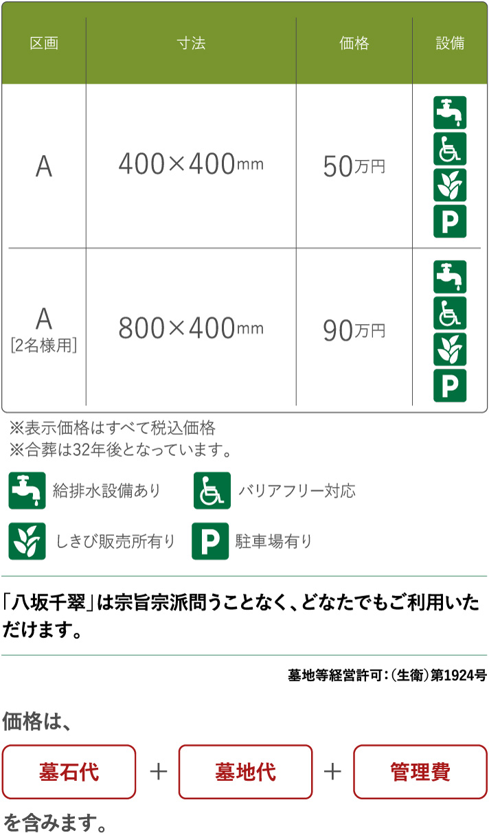 | 区画 | 寸法 | 永代使用料 | 年間管理費 | 設備 |